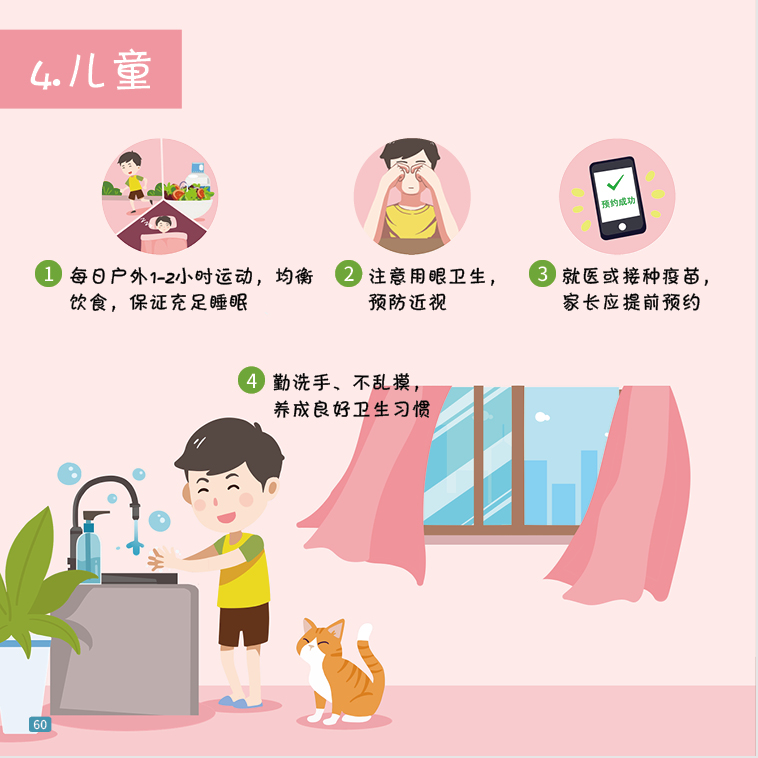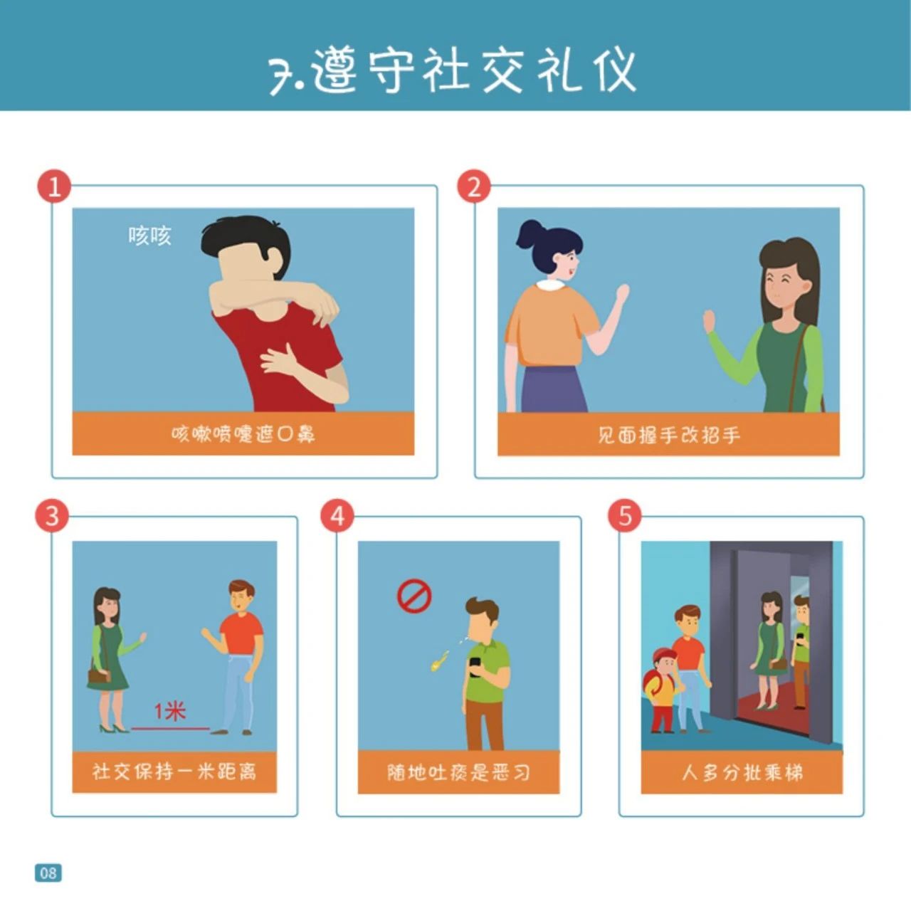《公民防疫行為準(zhǔn)則》(科普版)共三部分73類。 第一部分為公民防疫基本行為準(zhǔn)則,包括勤洗手、戴口罩、少聚集、分餐制、社交禮儀以及廁所衛(wèi)生、通風(fēng)與消毒、健康生活等八方面; 第二部分和第三部分針對重點場所、重點人群主動防疫的關(guān)鍵風(fēng)險點,對不同場景、不同人群提出健康防護(hù)準(zhǔn)則。 旨在通過圖文并茂、貼近生活的形式,讓公眾看得懂、易接受、記得牢、做得到,將公民防疫行為準(zhǔn)則作為一種社會文明風(fēng)尚和健康生活方式,持久地堅持下去、推廣開來。