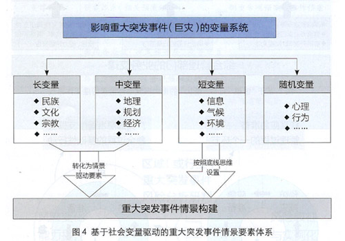 重大突發(fā)事件本身是一個復(fù)雜系統(tǒng)。當(dāng)嘗試通過“情景構(gòu)建”來表征重大突發(fā)事件的規(guī)律特點(diǎn)時,按照社會物理學(xué)理論,需要對一系列社會變量進(jìn)行描述,決定重大突發(fā)事件情景的變量包含:長變量(與民族、文化、宗教相關(guān)的變量)、中變量(與地理、規(guī)劃、經(jīng)濟(jì)、社會相關(guān)的變量)、短變量(與信息、氣候、環(huán)境、交通等相關(guān)的變量)、隨機(jī)變量(與心理、行為以及未知因素相關(guān)的變量)(見圖4)。為確保重大突發(fā)事件情景能夠準(zhǔn)確地代表不斷演化的國家風(fēng)險(或者地區(qū)風(fēng)險),情景構(gòu)建過程中,需將上面所述的長變量與中變量設(shè)置為情景恒定要素,當(dāng)這兩類變量發(fā)生變動時,需要及時修訂情景;此外,關(guān)于短變量,應(yīng)該基于“底線思維”,設(shè)置可能導(dǎo)致事件往最壞方向發(fā)展的變量,這樣可以有效保證與情景所匹配的目標(biāo)能力具備“冗余”。而隨機(jī)變量,對于情景構(gòu)建來說不具備較大價值,不應(yīng)該在情景中描述。
