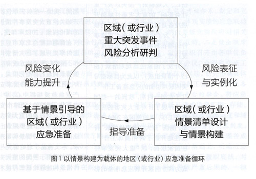 情景構(gòu)建是一個地區(qū)(或行業(yè))的戰(zhàn)略風(fēng)險管理工具,在地區(qū)(或行業(yè))的重大突發(fā)事件風(fēng)險研判基礎(chǔ)上,可以確定地區(qū)(或行業(yè))情景清單并且對每項(xiàng)典型風(fēng)險開展情景構(gòu)建,對典型風(fēng)險進(jìn)行實(shí)例化表征;在情景構(gòu)建結(jié)束后,一系列情景可以引導(dǎo)地區(qū)(或行業(yè))有的放矢開展應(yīng)急準(zhǔn)備行動,指導(dǎo)應(yīng)急能力的提升;伴隨著風(fēng)險環(huán)境的變化、應(yīng)急能力的提高,在風(fēng)險研判基礎(chǔ)上,可以將情景清單進(jìn)行動態(tài)調(diào)整、或者對某項(xiàng)(不符合當(dāng)下風(fēng)險的)情景進(jìn)行修訂。如此,可以形成一個以“情景構(gòu)建”為載體的應(yīng)急準(zhǔn)備循環(huán),如圖1所示。