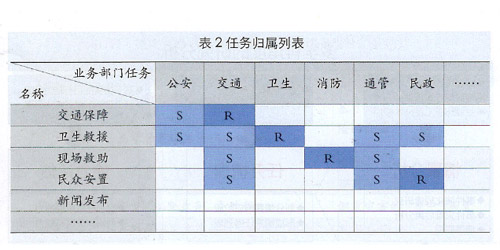 基于情景應(yīng)對的任務(wù)清單逐步清晰以后,可以通過業(yè)務(wù)部門的座談分析,明確各項(xiàng)任務(wù)的歸屬,得出表2所示的任務(wù)歸屬列表(R表示負(fù)責(zé)、S表示支持)。實(shí)踐表明,該項(xiàng)工作將會有效查漏補(bǔ)缺,優(yōu)化既有應(yīng)急機(jī)制,彌補(bǔ)體制上的條塊分割與碎片化問題。
