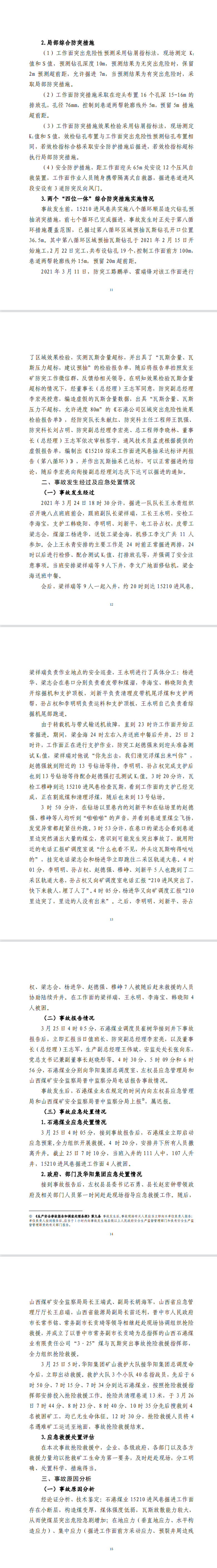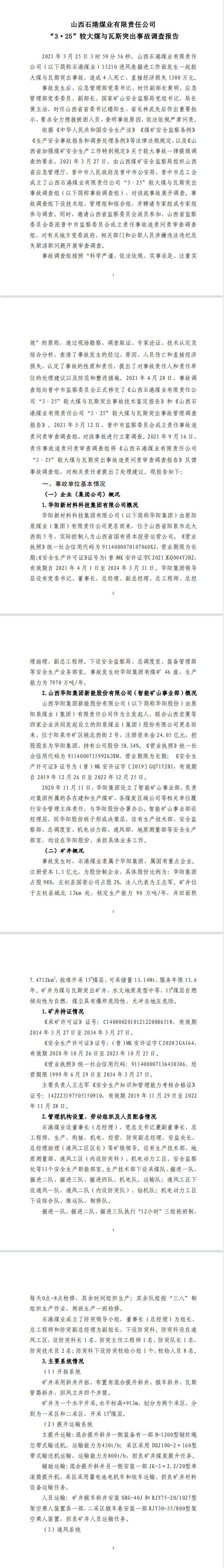 2021年3月25日,山西華陽集團石港煤業有限公司(以下簡稱石港煤業)15210進風巷掘進工作面發生煤與瓦斯突出事故,突出煤(矸)量為244t、瓦斯量為22882m3,造成4人死亡,直接經濟損失1300萬元,事故后遲報。