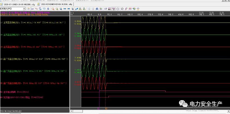 從調取的1#發變組故障錄波器的波形可知,在圖1 的T1 坐標2021 年7 月10 日19:58:33.8435 時刻,1 號主變高壓側A 相發生單相接地故障,T2 時刻19:58:33.8791 時刻,主變差動保護動作,19:58:33.9079 時刻,主變高壓側斷路器跳開。