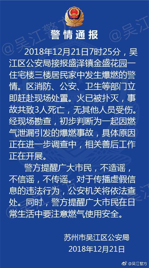 #警情通報?!娟P于盛澤鎮爆燃事故的警情通報】警方提醒廣大市民,不造謠,不信謠,不傳謠。對于傳播虛假信息的違法行為,公安機關將依法查處。同時,警方提醒廣大市民在日常生活中要注意燃氣使用安全。