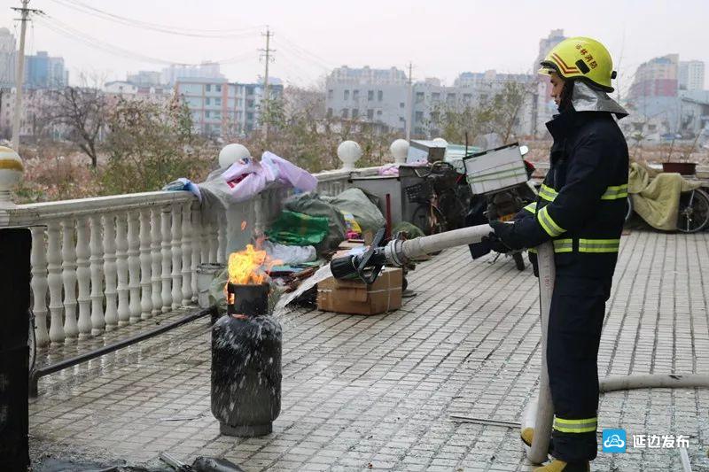 當天上午8點28分, 延吉市消防大隊特勤中隊接到報警:延吉市園丁新村10號樓附近,一煤氣罐發生氣體泄漏,由于操作不當,瞬間燃起大火,情況緊急。