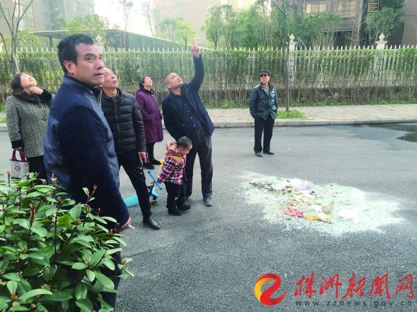 事發樓棟附近路面散落著許多玻璃碎渣