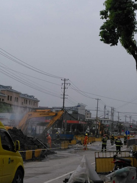 據附近市民介紹,近期,國權北路正在進行道路施工。昨天下午,一臺挖掘機在作業時,不慎將地下一根燃氣管道挖斷,頓時,大量氣體從管道內噴出,空氣中還彌漫著一股濃烈的煤氣味。目擊者稱,管道被挖破后,現場噴出白色氣體,并不斷發出“嗤嗤”的聲音,工人們見狀,趕緊將挖掘機熄火。