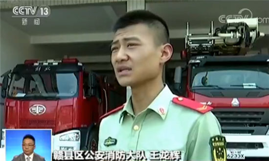 5月23日下午3點多,江西省贛州市贛縣區城南大道的濱江花城小區有一居民樓突發火災,現場熊熊大火,直冒濃煙,接到報警后,王龍輝和隊員們迅速趕往現場進行滅火。
