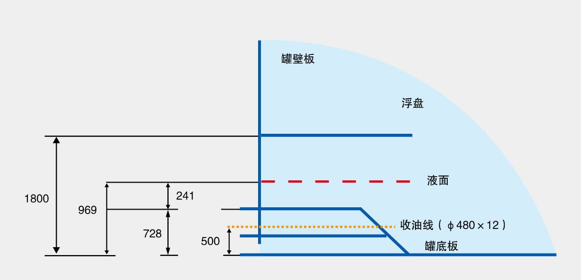 經計算, 875#收油前罐內浮盤與液面之間存在0.831米高度的氣相空間,體積約為1000立方米。
