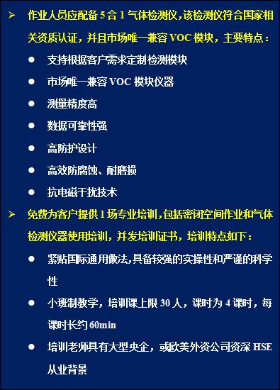 方案二 | (4)泵吸式4合1氣體檢測儀 (5)《授權氣體檢測員培訓》+《密閉空間作業(yè)安全培訓》 贈送2名工人的“密閉空間作業(yè)安心包”產(chǎn)品。 |